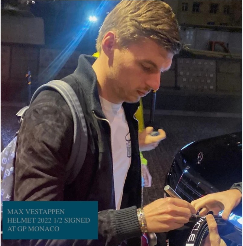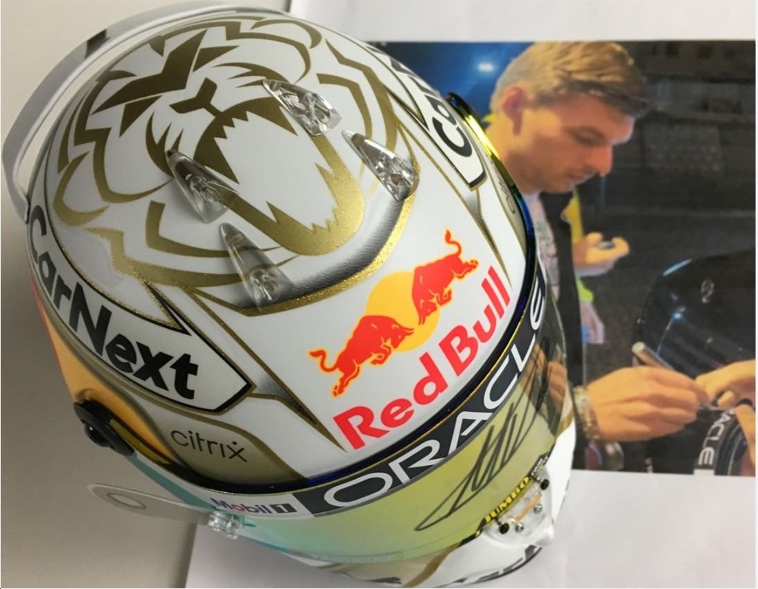 SCHUBERTH 1/2 SCALE HELMET HAND SIGNED BY MAX VERSTAPPEN 2th WORLD CHAMPION at SUZUKA JAPANESE GP 2022 / COLORED REFLECTIVE VISOR & SPOILER & AIR VENTS WITH START NUMBER 1 / EXTRA:CHIN SPOILER+WITH MV STORE PROMO CARD