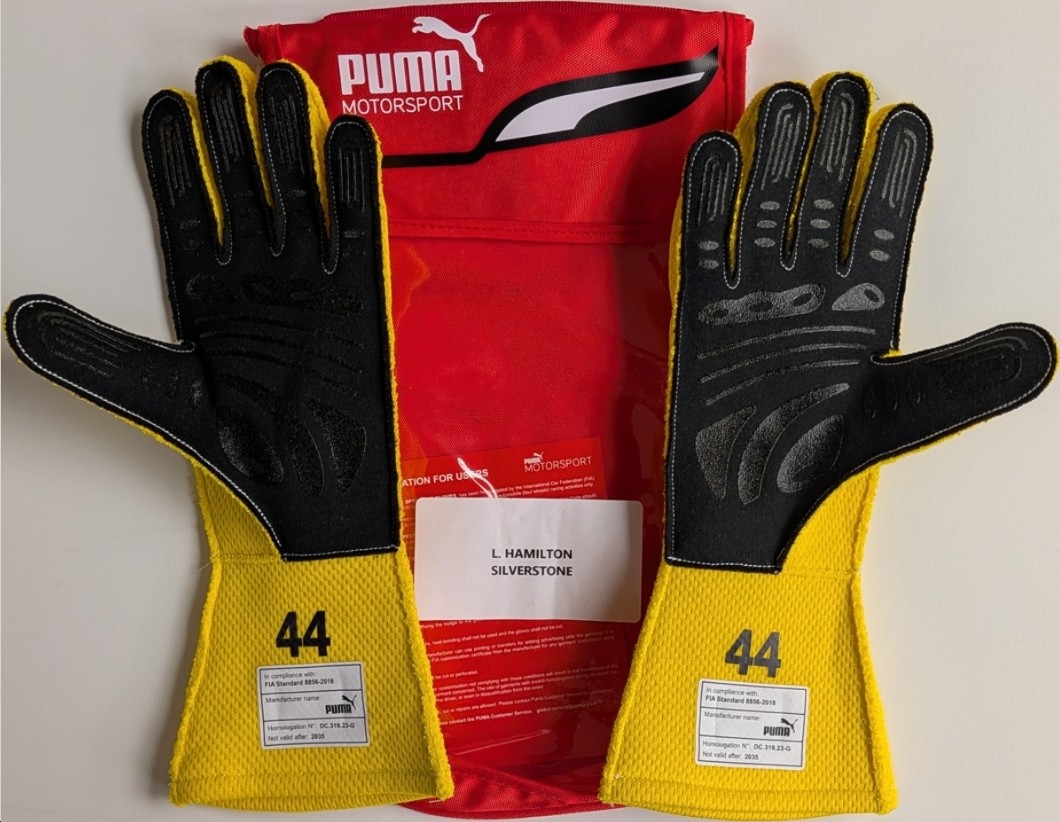 PUMA OFFICIAL PRODUCTS LEWIS HAMILTON 2025 PAIR GLOVES SILVERSTONE 2025 with PUMA-BAG