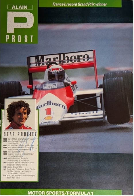 ALAIN PROST HAND SIGNED PICTURE BIO McLAREN TAG PORSCHE MP4/3 1987