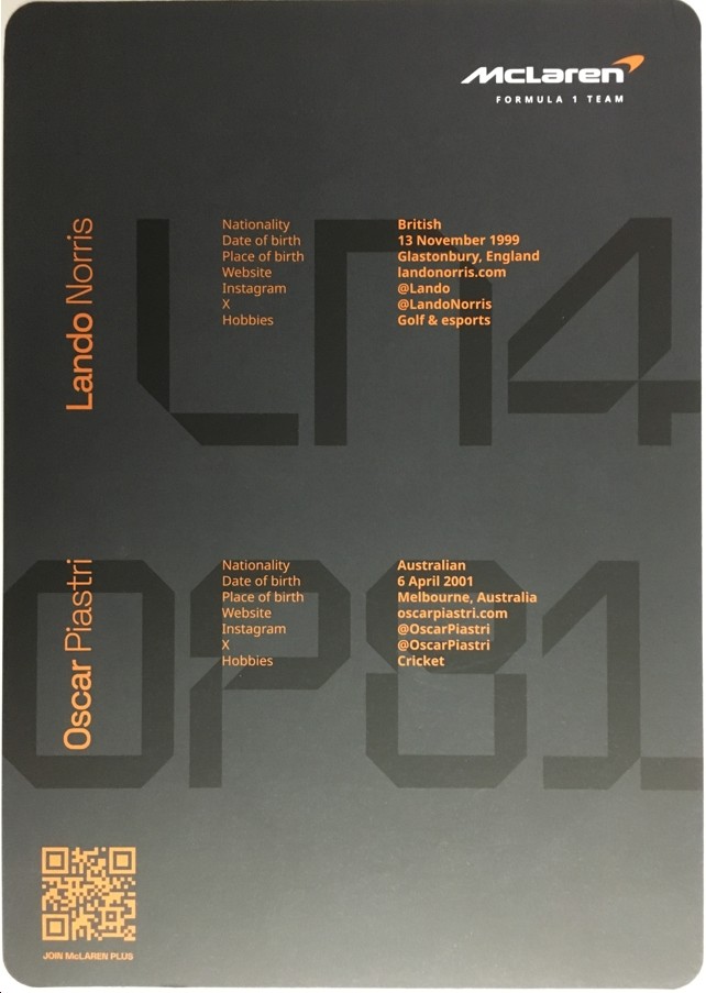 2025 McLAREN FORMULA 1 TEAM-DRIVERS LARGE CARD / LN4-LANDO NORRIS & OP81 OSCAR PIASTRI