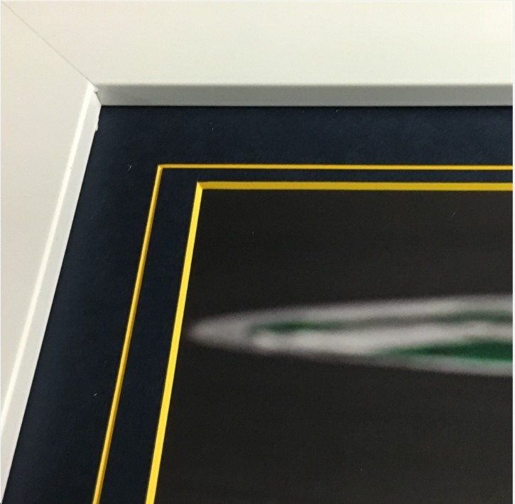 - サイズ : W34.5xH25.5xD1.5㎝ / 額:ウッド・ホワイト x 2層マット:ネイビー x Eイエロー & Vグルーブ・ワイド加工+UVカットPET