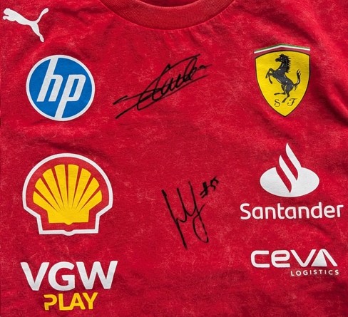 FERRARI HP DRIVERS ISSUE DESERT-SUN DAMAGED T-SHIRT LAS-VEGAS GP 2024 HAND SIGNED BY LECLERC & SAINZ